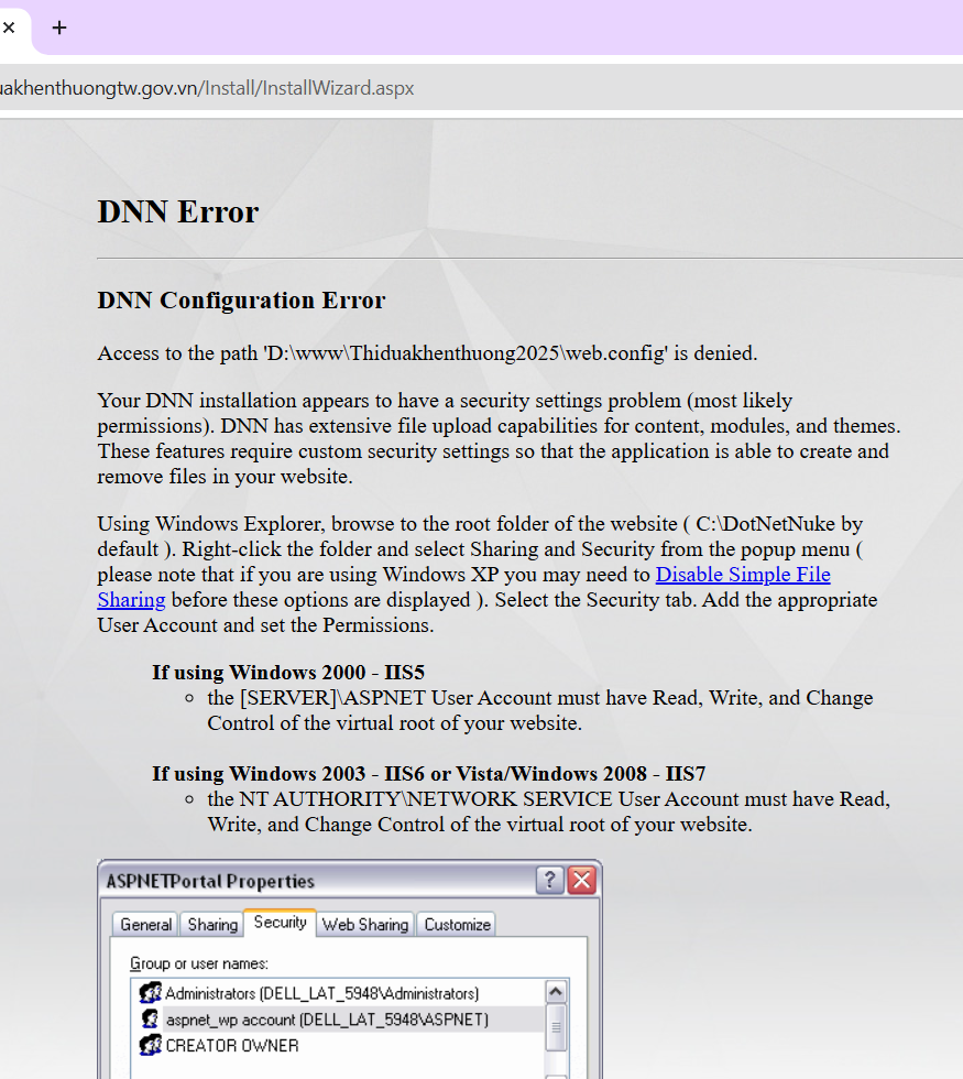 Nói chung là để cài được, quản trị phải phân quyền thêm cho tài khoản của IIS để nó có thể truy cập vào file web.config và các file khác.