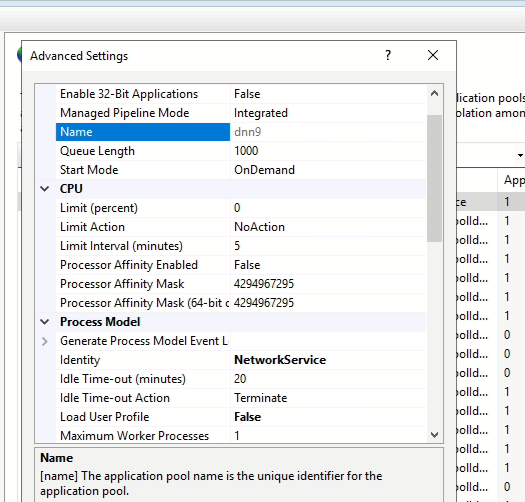 - Thay đổi tài khoản từ AplicationPoolId thành NetworkService